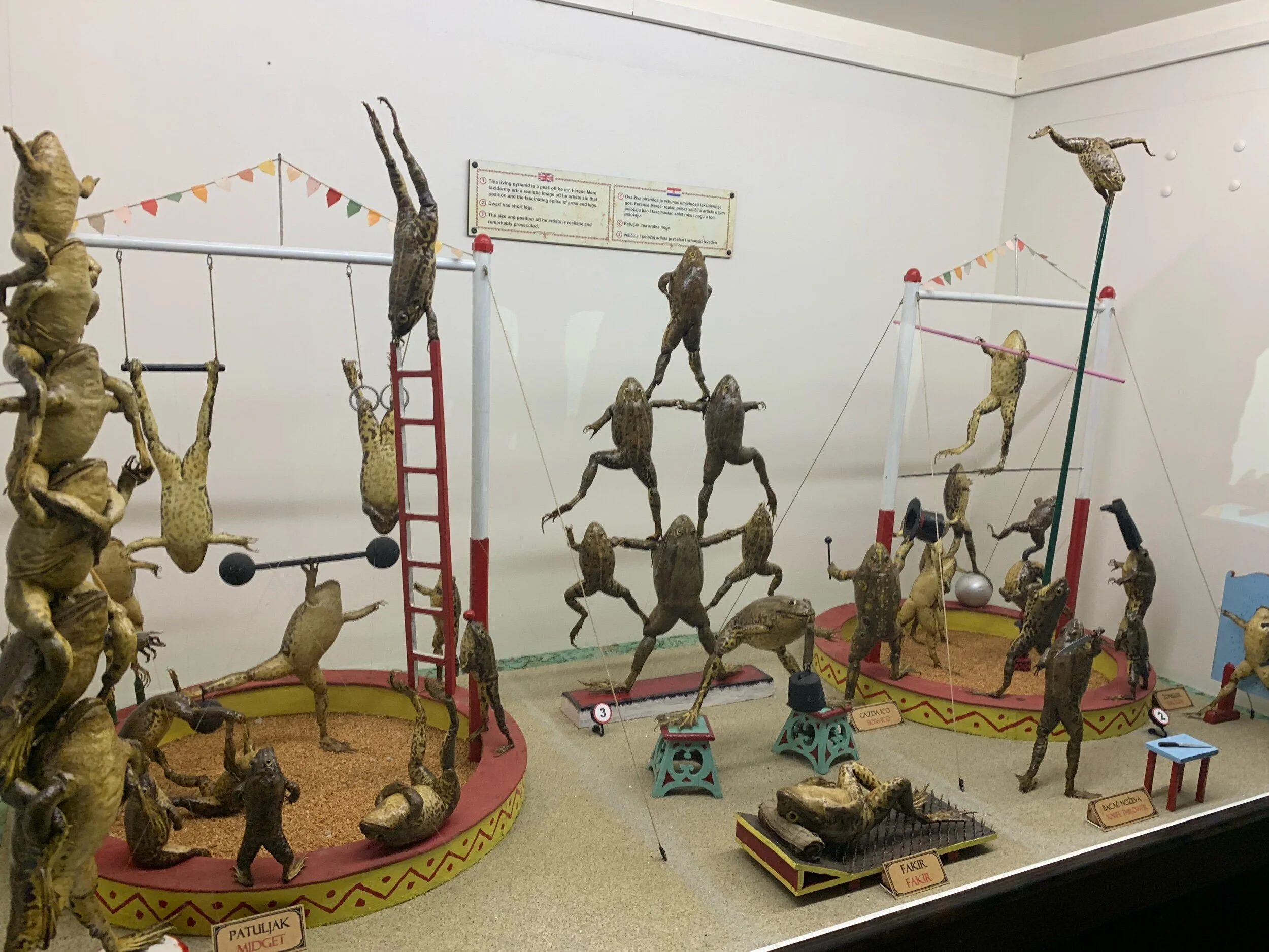 To my surprise, it was a taxidermy museum. Yep—an entire building dedicated to frogs dressed up and posed like little humans. School frogs. Tennis frogs. Circus frogs. Some might say I paid too much to stare at dead amphibians wearing tiny clothes. But honestly? It was weirdly inspiring.